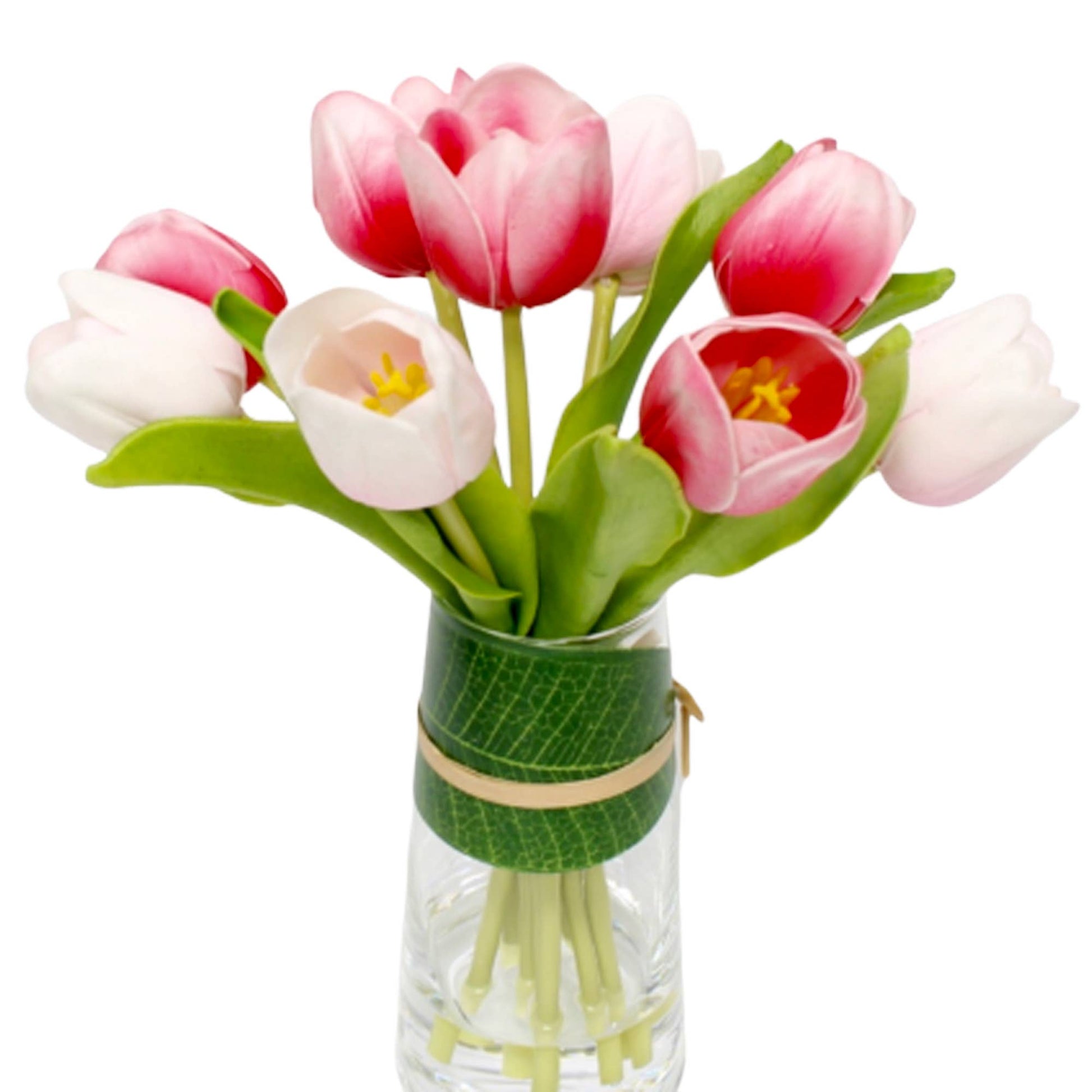 11" Tabletop centerpiece-faux real touch tulip in Glass Vase