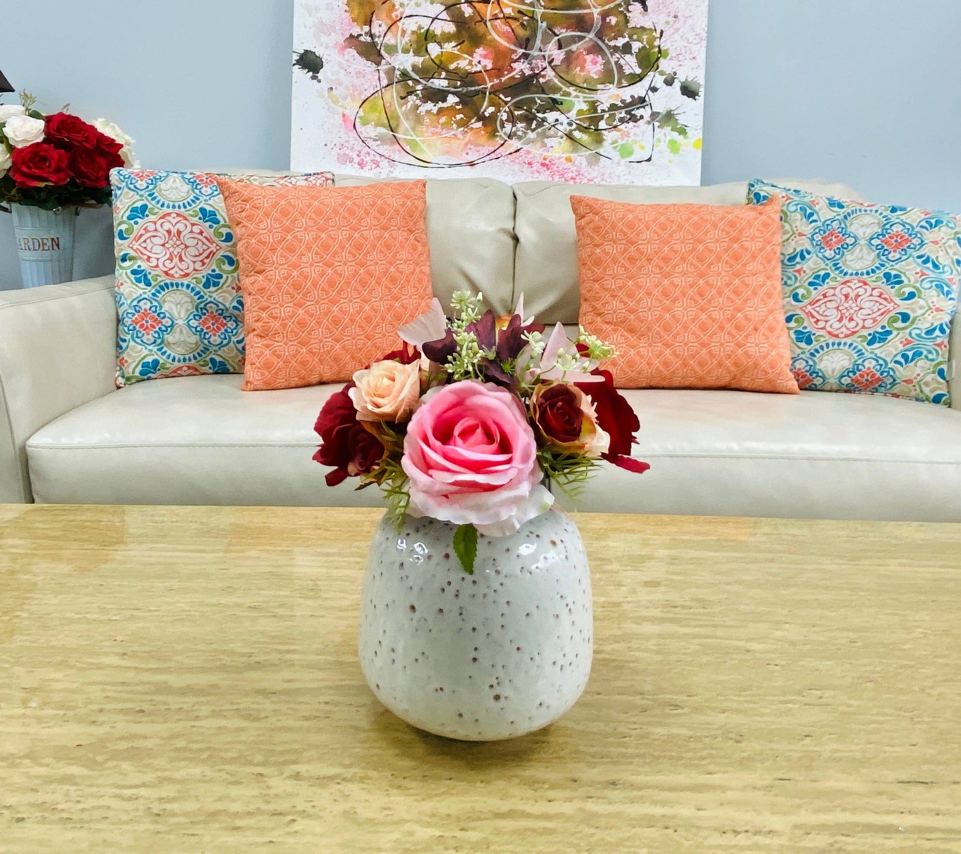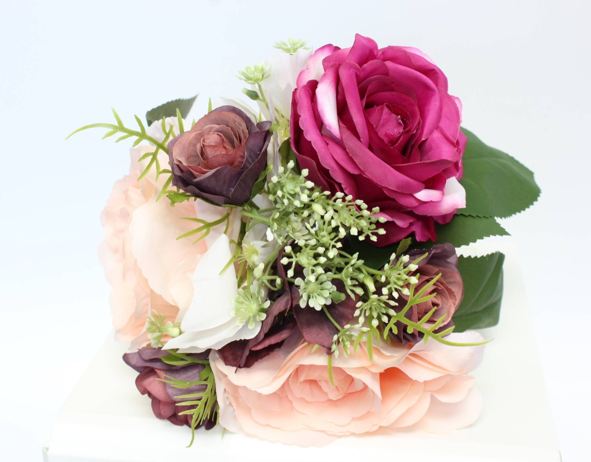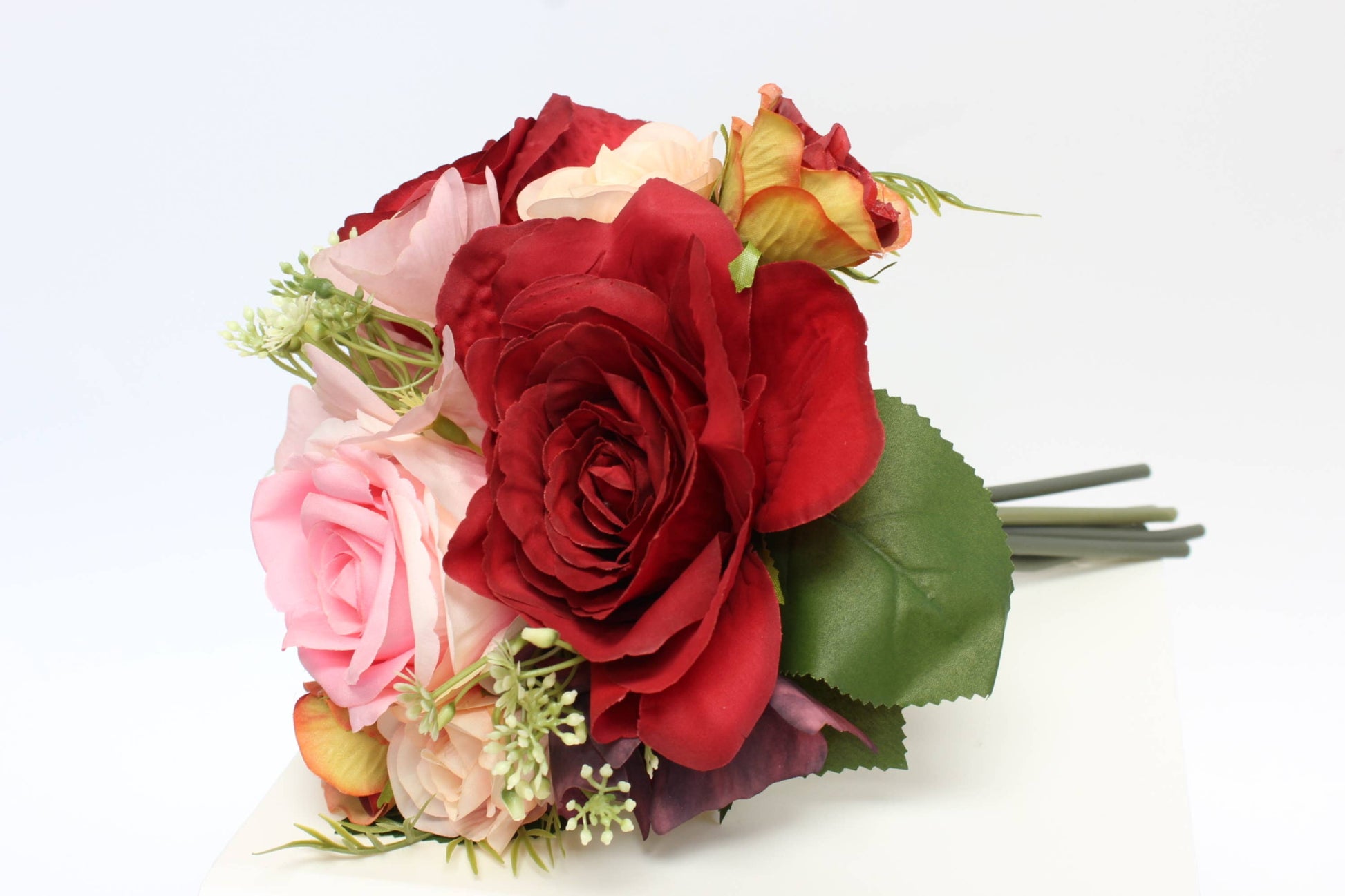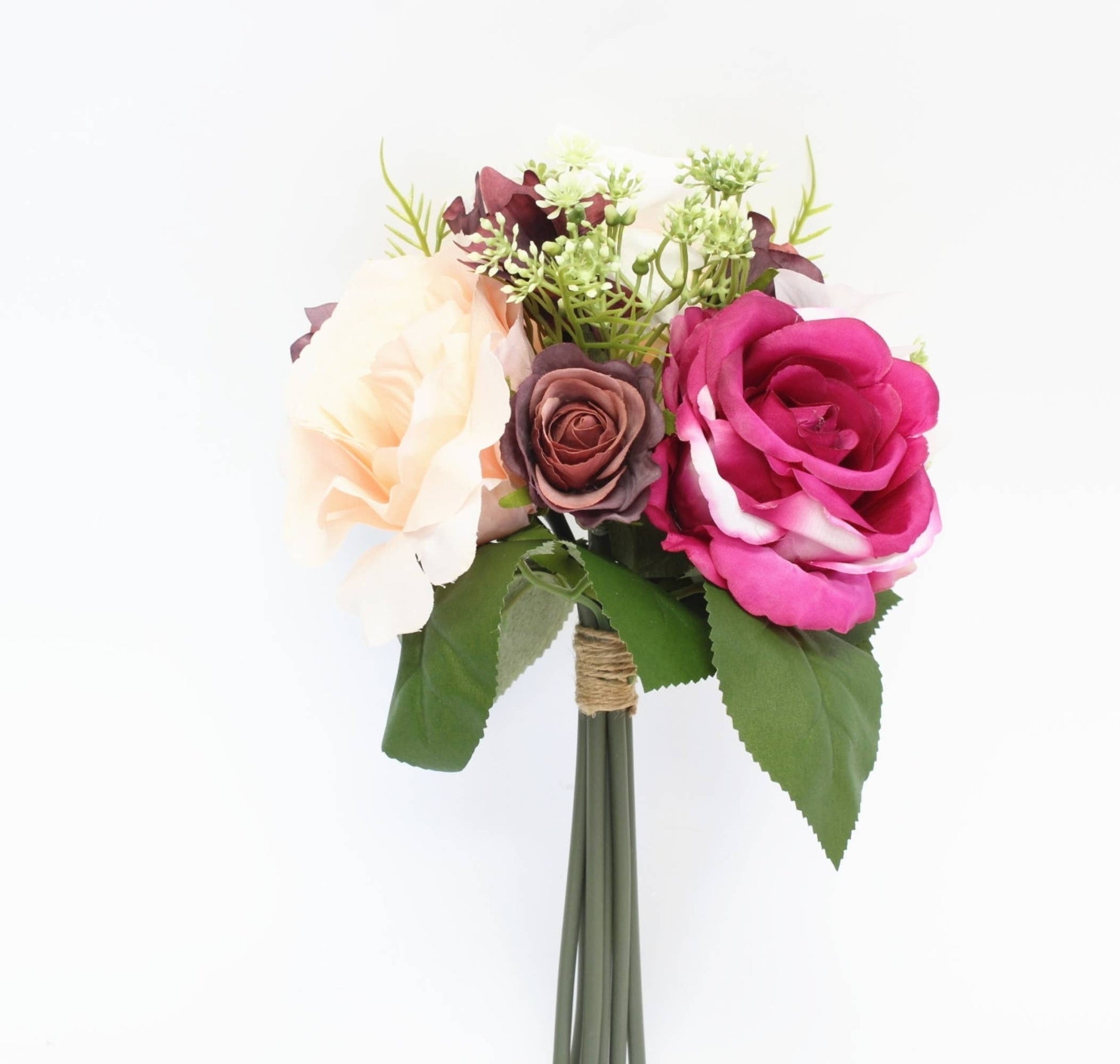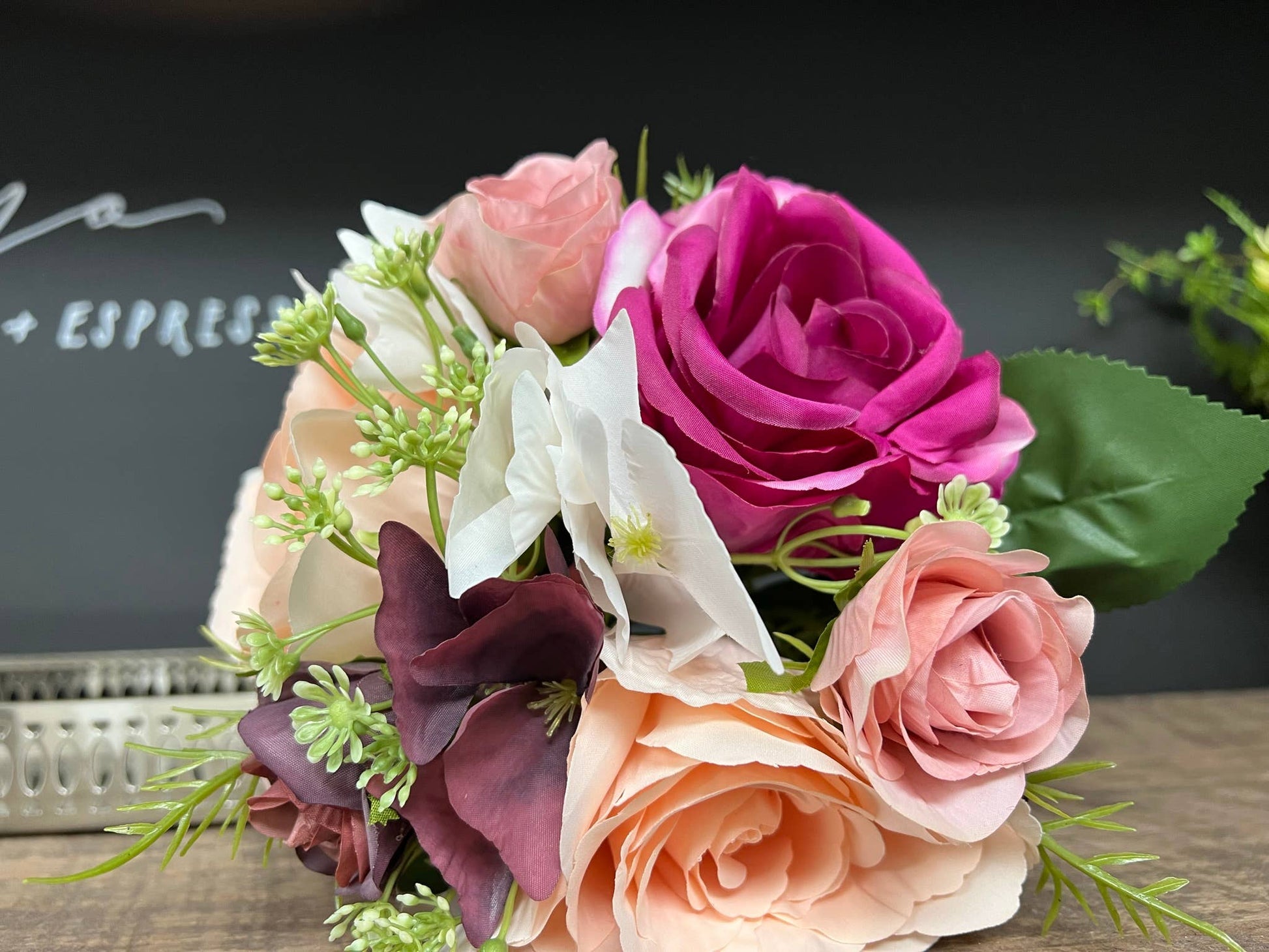 Large Bloom roses with rose buds, hydrangeas, and greenery filler, the vibrant color bouquet fits the bill for any wedding no matter the season, and also makes a beautiful drop in vase arrangement.
