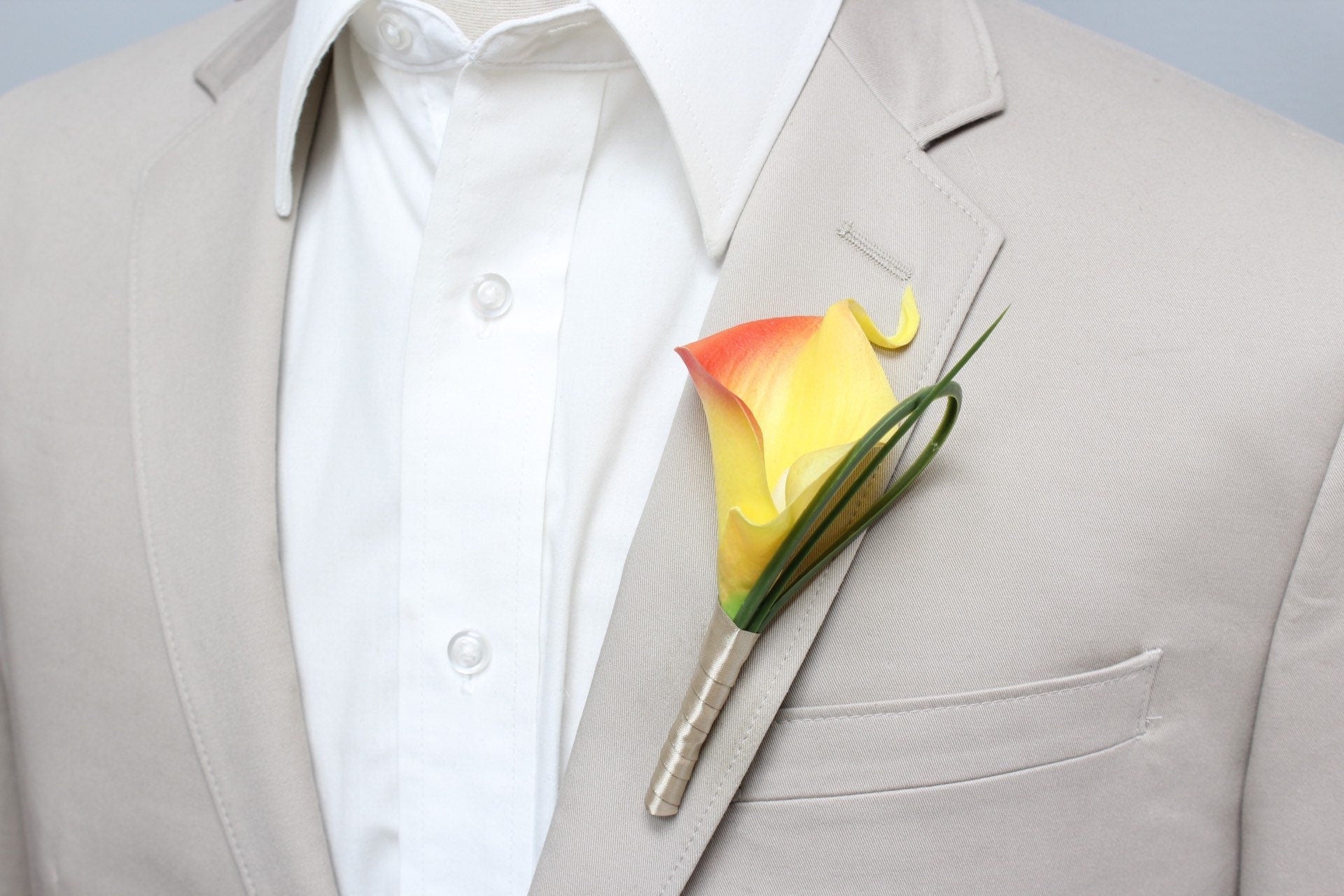 The elegant boutonniere made with live-like real touch calla lily , accents with green long grass.