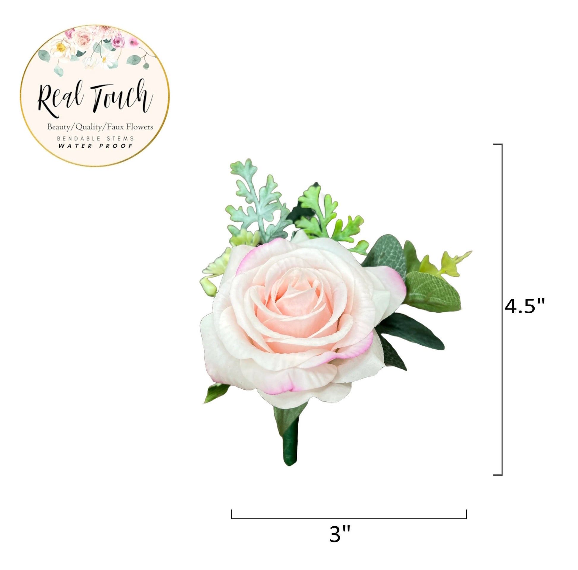 The wrist corsage is elegantly secured with a pearl-embellished band, ensuring it stays in place throughout your event. The matching boutonniere is easy to attach with a pearl-headed pin, offering a seamless addition to any lapel.