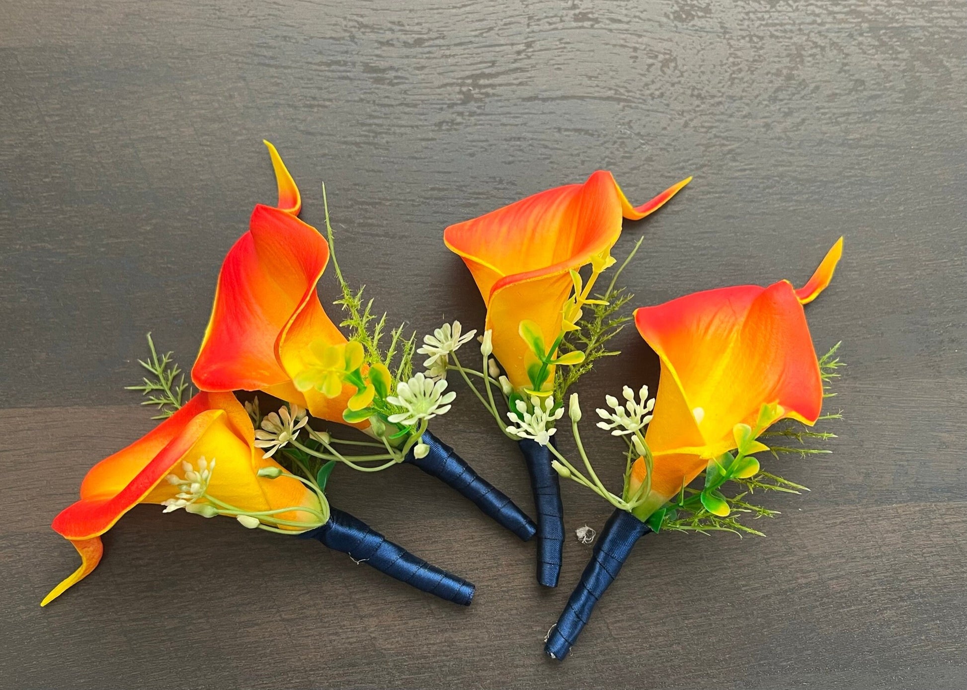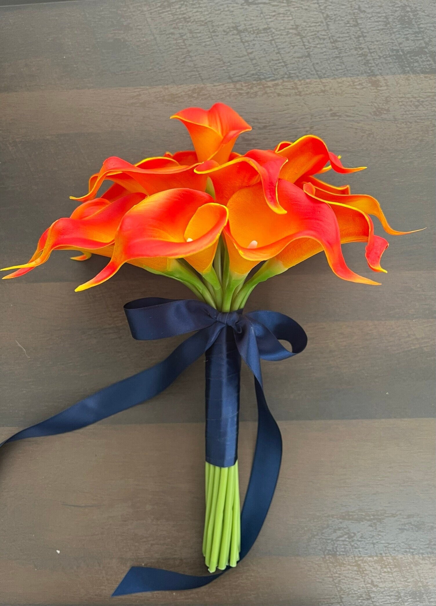 Step into a world of elegance and charm on your wedding day with our Luxurious Persimmon Tangerine Calla Lily Wedding Ensemble. Handcrafted with precision, our Real Touch calla lilies boast a realistic look and feel, ensuring your bouquet and boutonniere set stands as a testament to timeless sophistication.