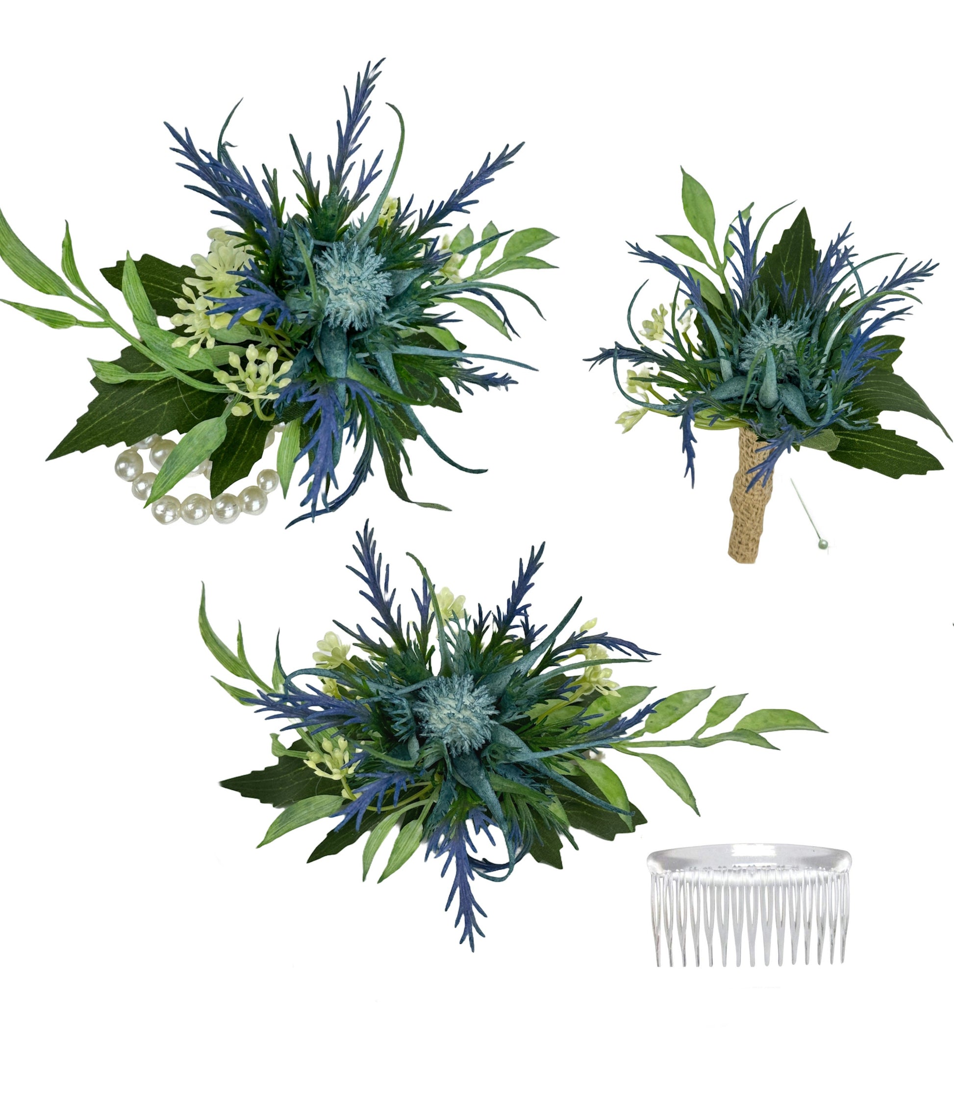 Navy Blue Thistle Artificial Wedding Set - Corsage, Boutonniere & Hair Comb