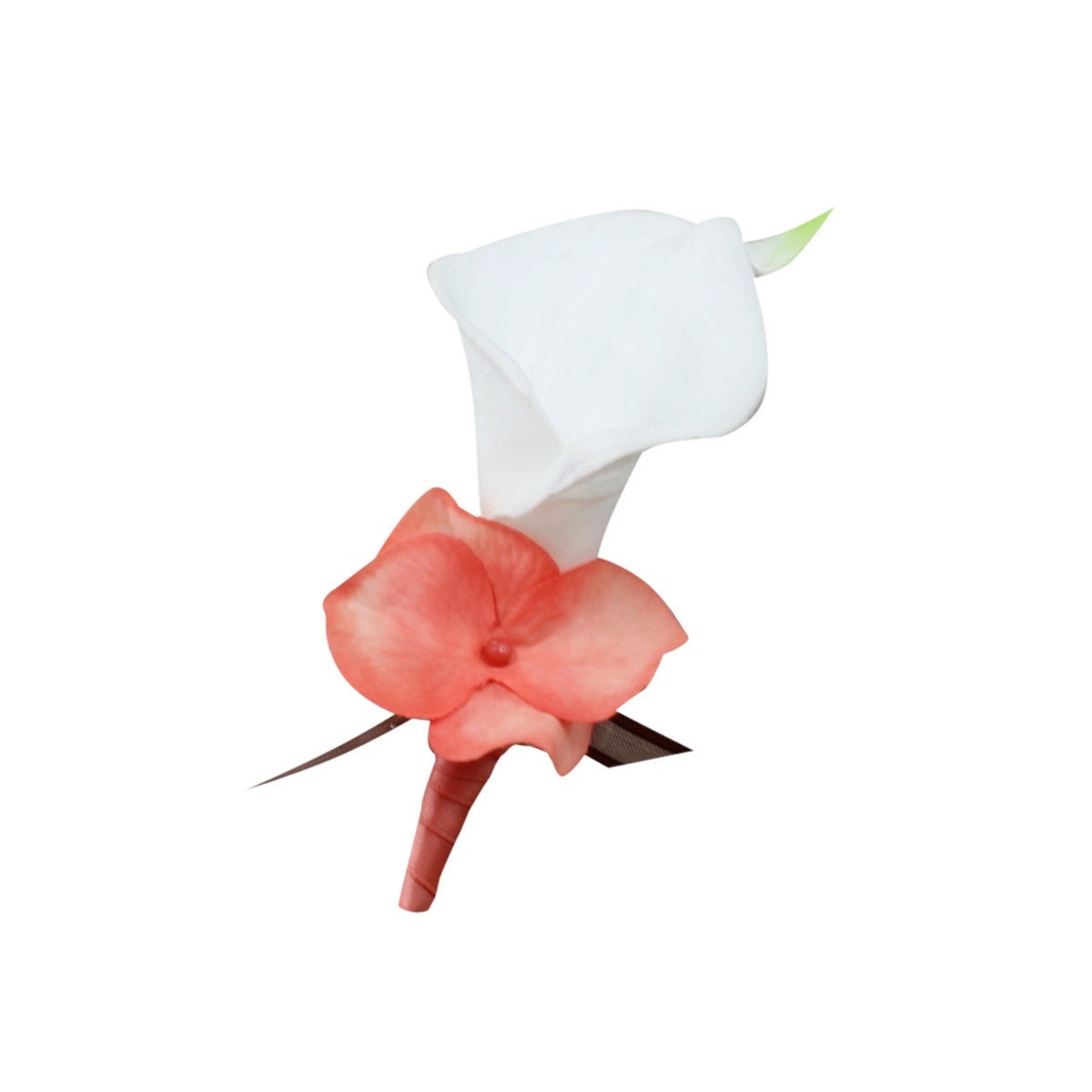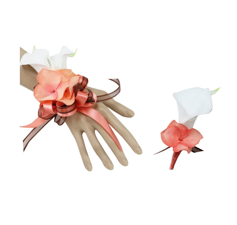 - Wrist Corsage: Exquisitely crafted with premium artificial calla lilies and silk hydrangeas in a beautiful peach coral reef and brown palette. Customers are given the choice between a flexible/stretchy pearl wristband or a sparkling rhinestone band, enabling a customizable touch of elegance.