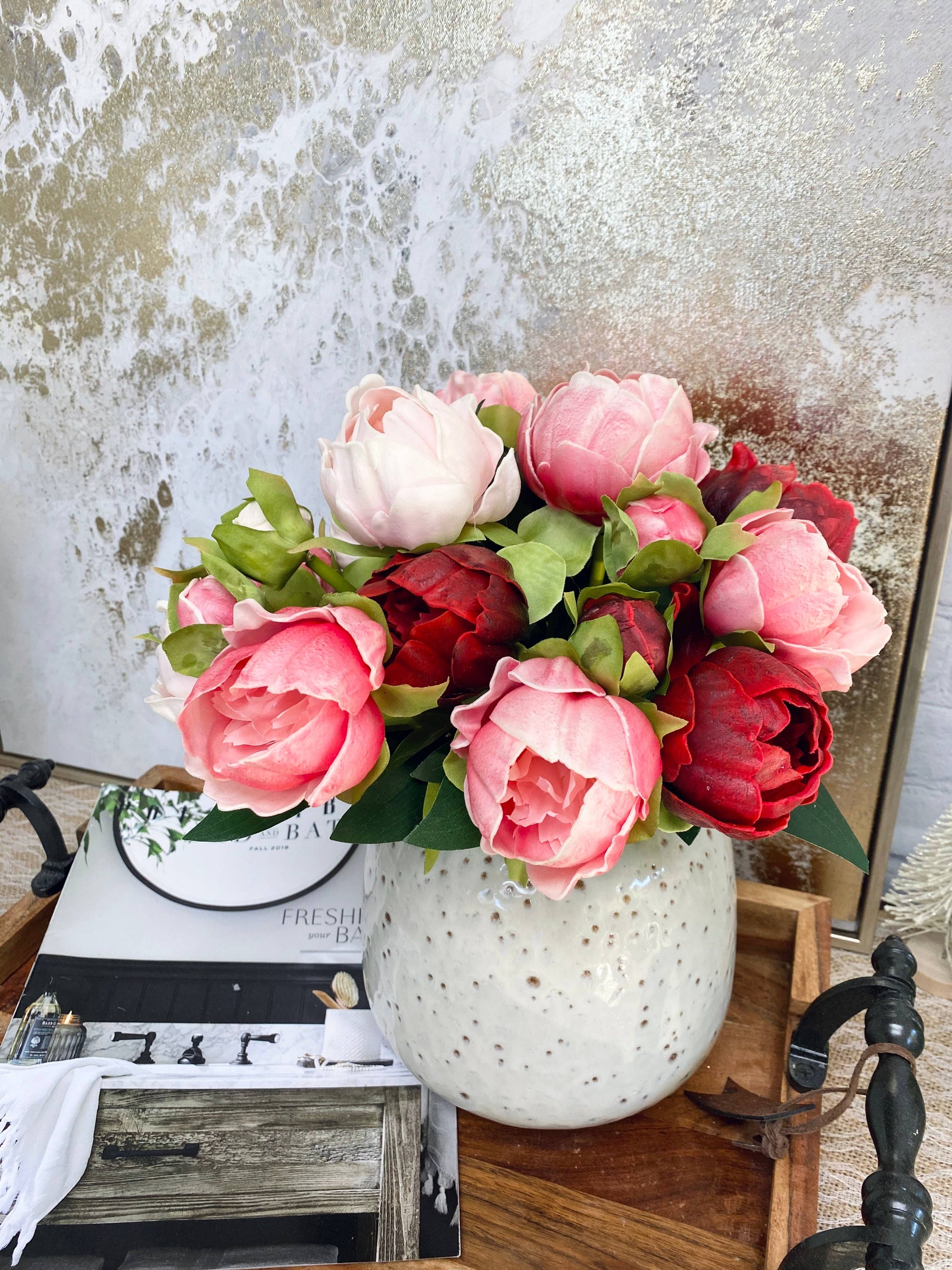 This classic peony bouquet offers the perfect balance of beauty and realism. Each handmade flower is crafted with real touch material, and looks and feels just like a fresh-cut peony. This timeless bouquet will give you a continuously beautiful and fragrant display for years to come.