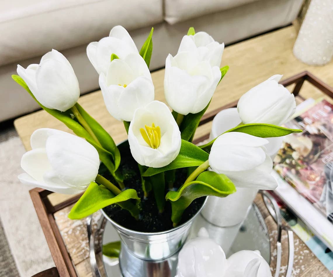 Realistic soft touch tulip centerpiece, a perfect touch to home decorations. This timeless look will never go out of style, adding a sophisticated design element to any space.