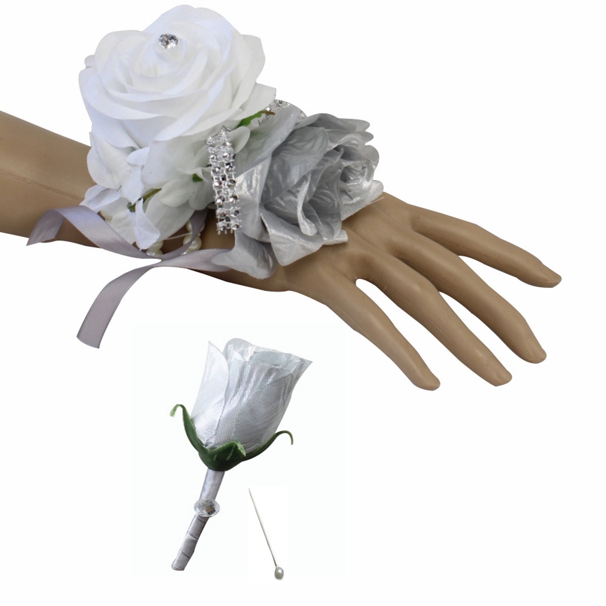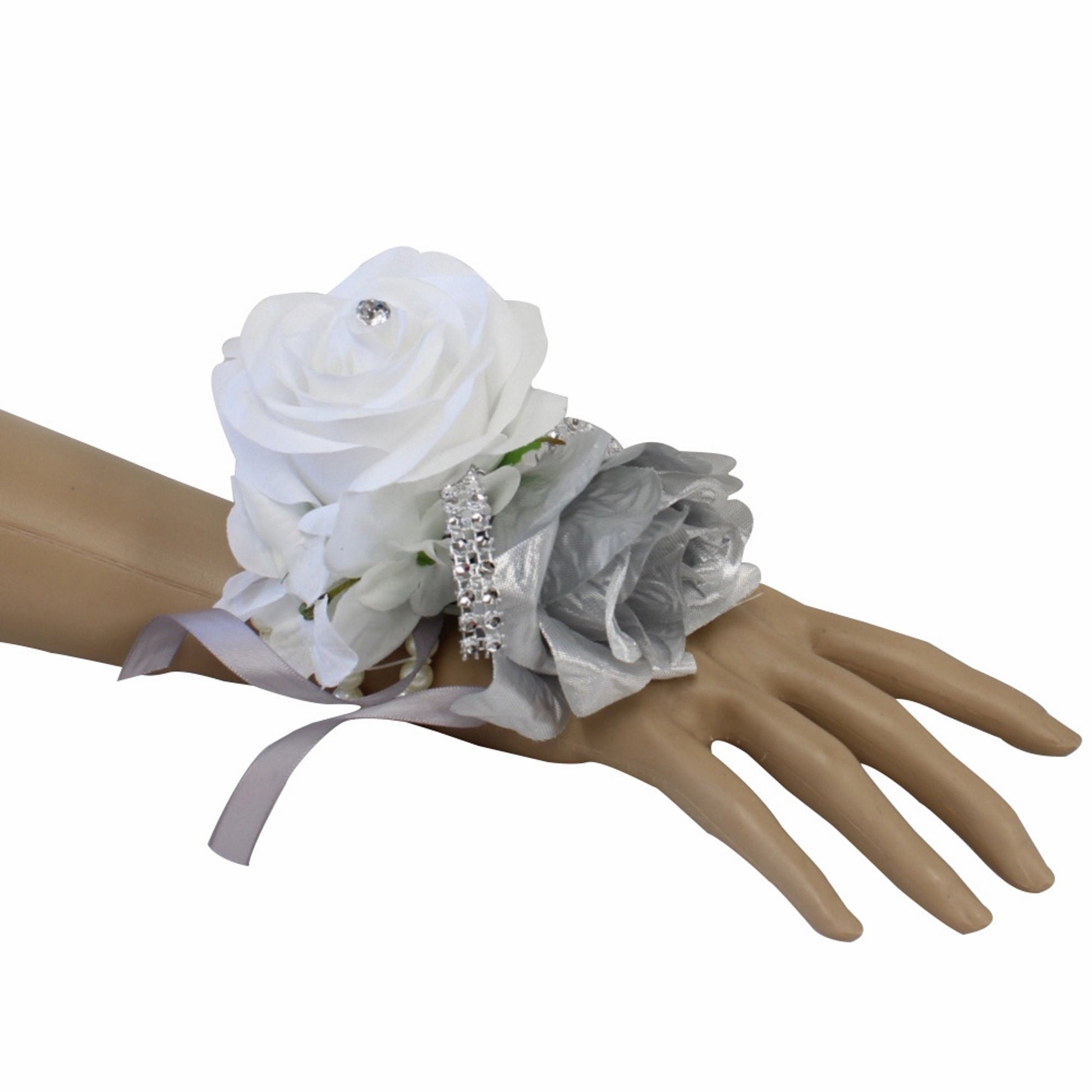 - Wrist Corsage: A symphony of metallic silver and pure white roses, set against a backdrop of soft hydrangea petals, and adorned with glittering details. The ensemble is perfected with a chic pearl wrist band, ensuring comfort and style. Dimensions: 5" L x 3-4" W.