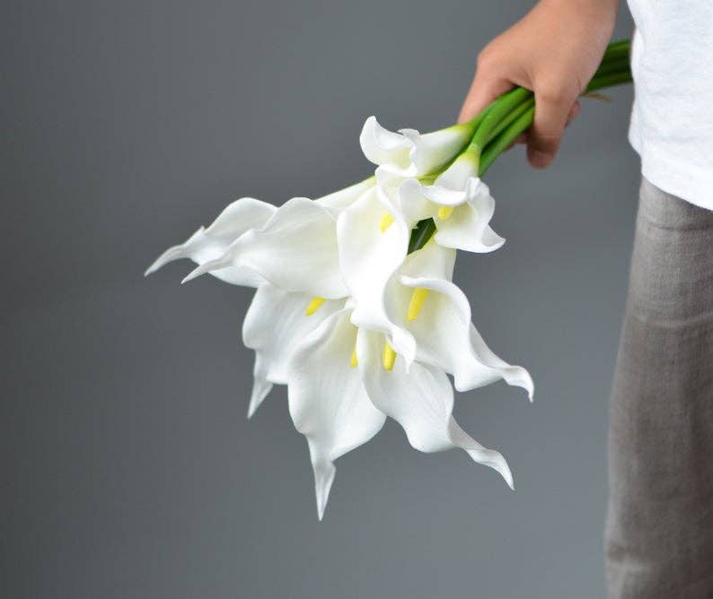 Style your artificial floral arrangements and wedding flower bouquets with the best real touch flowers inspired by nature like this ultra soft calla lily bouquet. Plastic, wired stem easily able to be shaped for floral arrangement.
