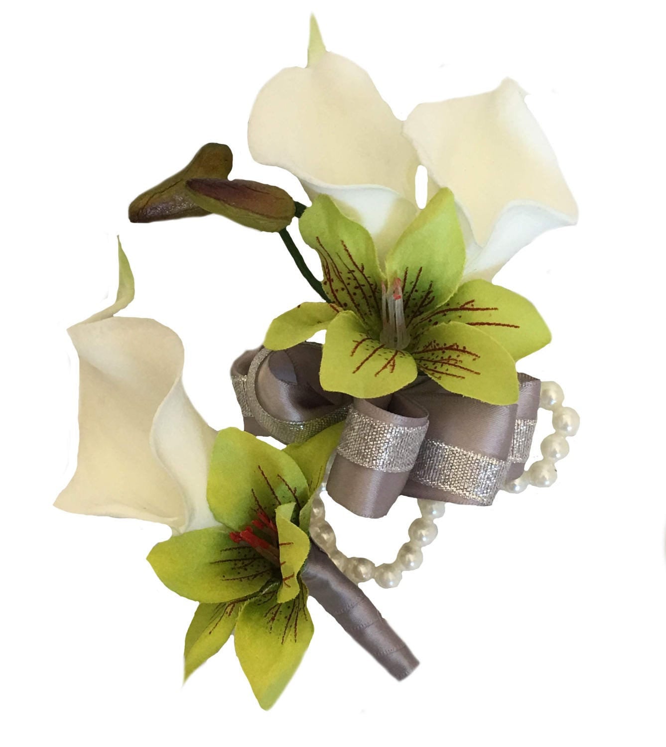Discover timeless sophistication with our meticulously handcrafted Wrist Corsage and Boutonniere Set, perfect for enhancing your wedding, prom, or formal event attire. This elegant duo brings together the delicate allure of real touch Calla Lilies and silk Orchids in a stunning lime green and white color palette, accented with tasteful silver and gray ribbons for a finish that's nothing short of breathtaking.