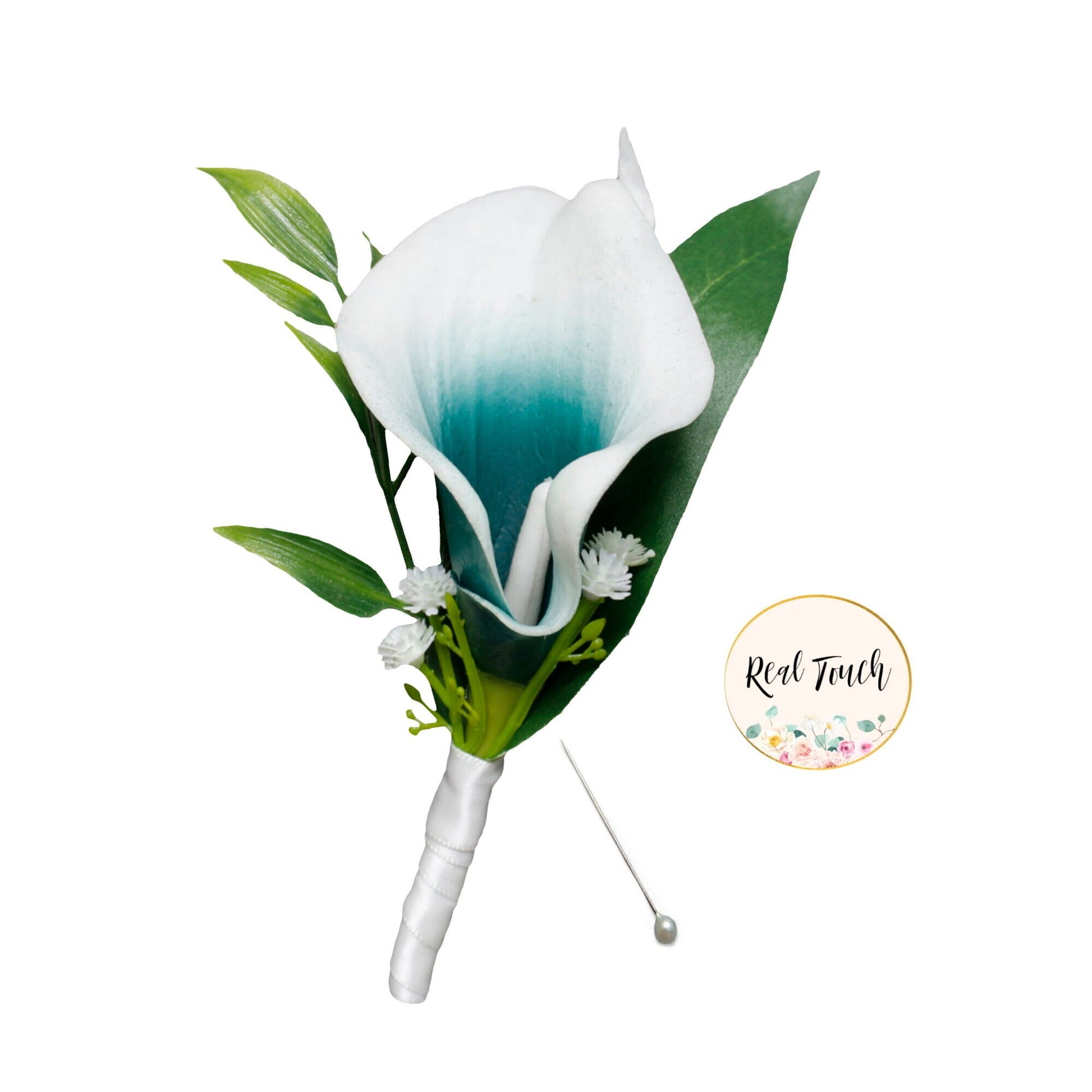 Immerse yourself in the undying allure of our Teal Calla Lily Boutonniere, skillfully crafted by hand to highlight your elegance. Ideal for enduring any climate, this stunning boutonniere not only elevates your style but also serves as a memorable keepsake in your shadow box long after the celebration ends.